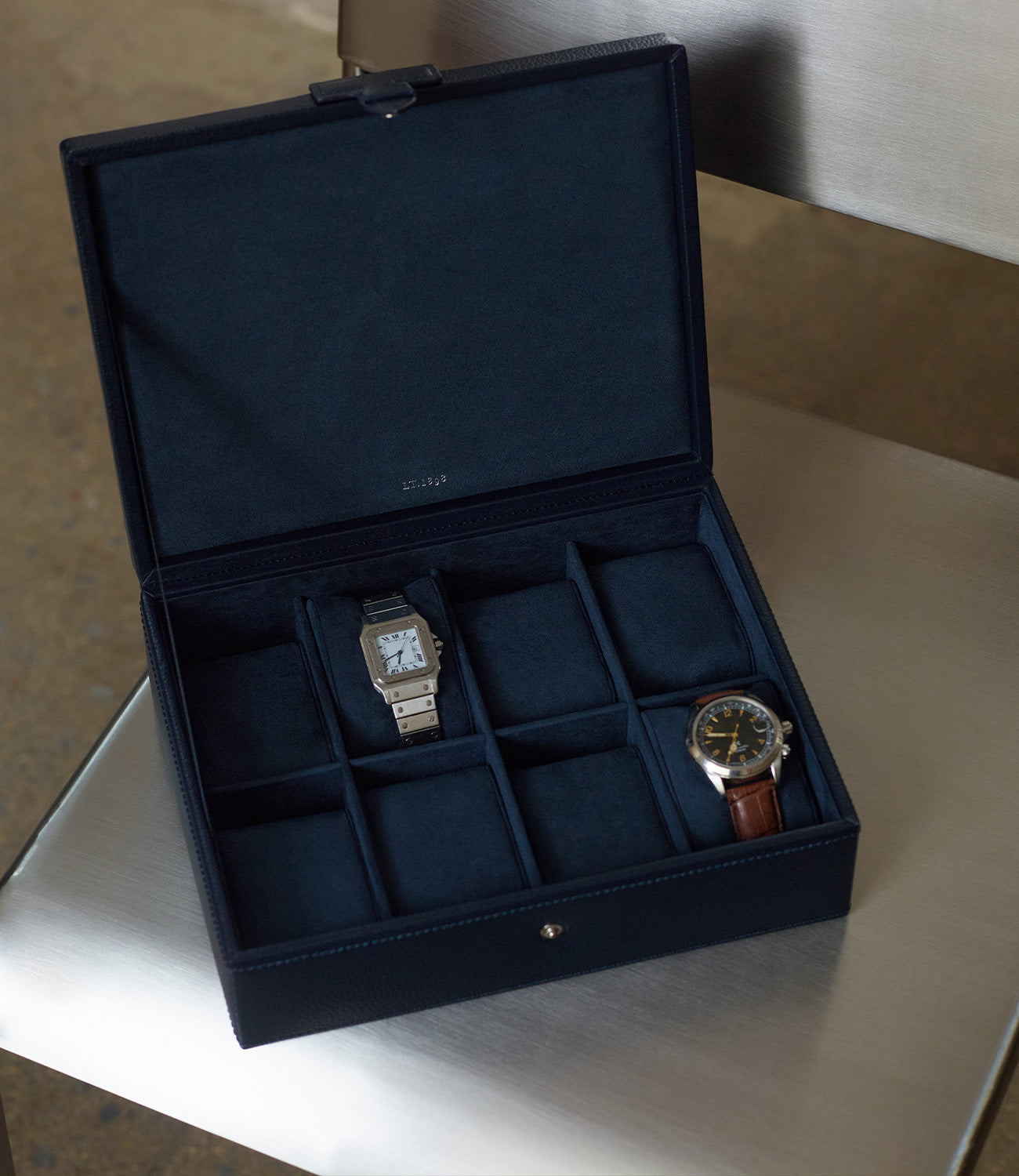 03 Certains de nos coffrets à montres sont fabriqués en cuir recyclé, composé à 95 % de chutes de tanneries, offrant l'apparence et le toucher du cuir neuf.