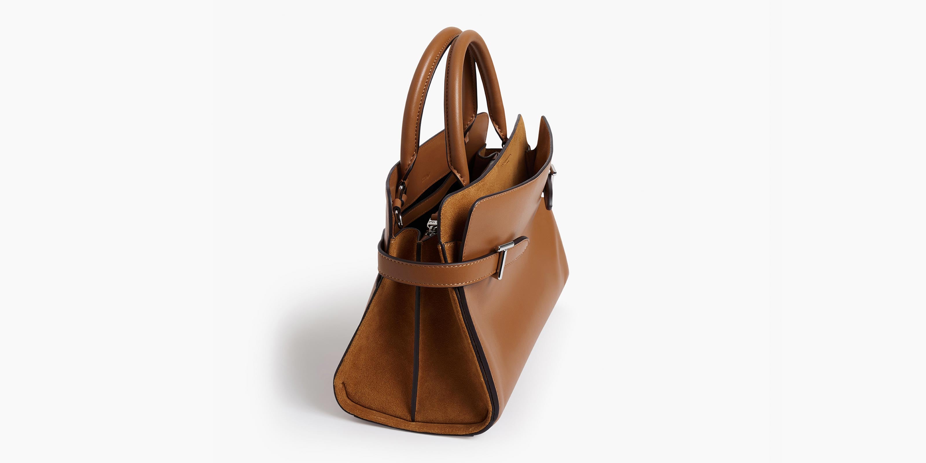 Aquí, el asa de mano combina elegancia y confort con una asa de cuero