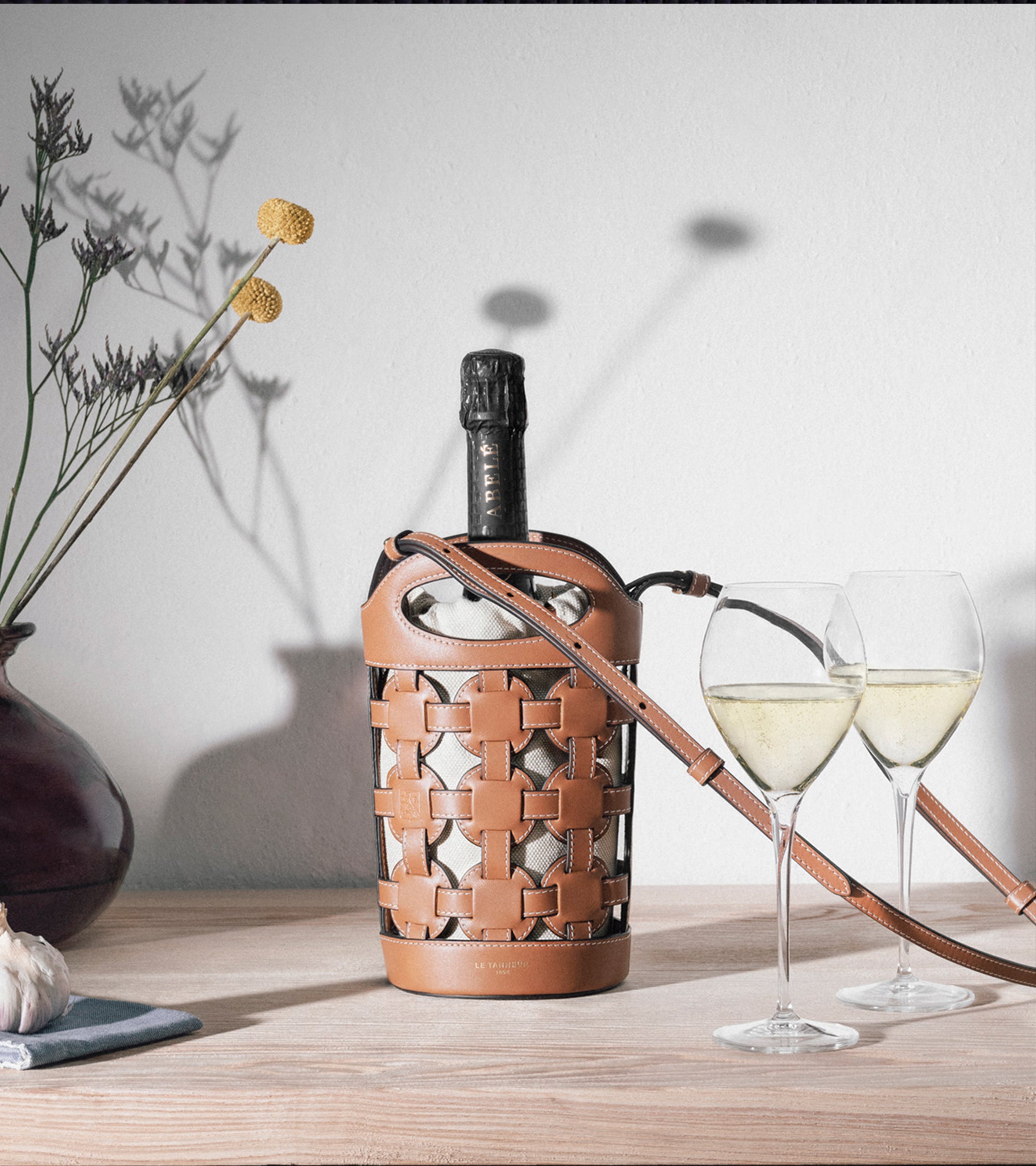 They have come together for a unique collaboration: a woven leather bottle bag designed to carry the fine bubbles of