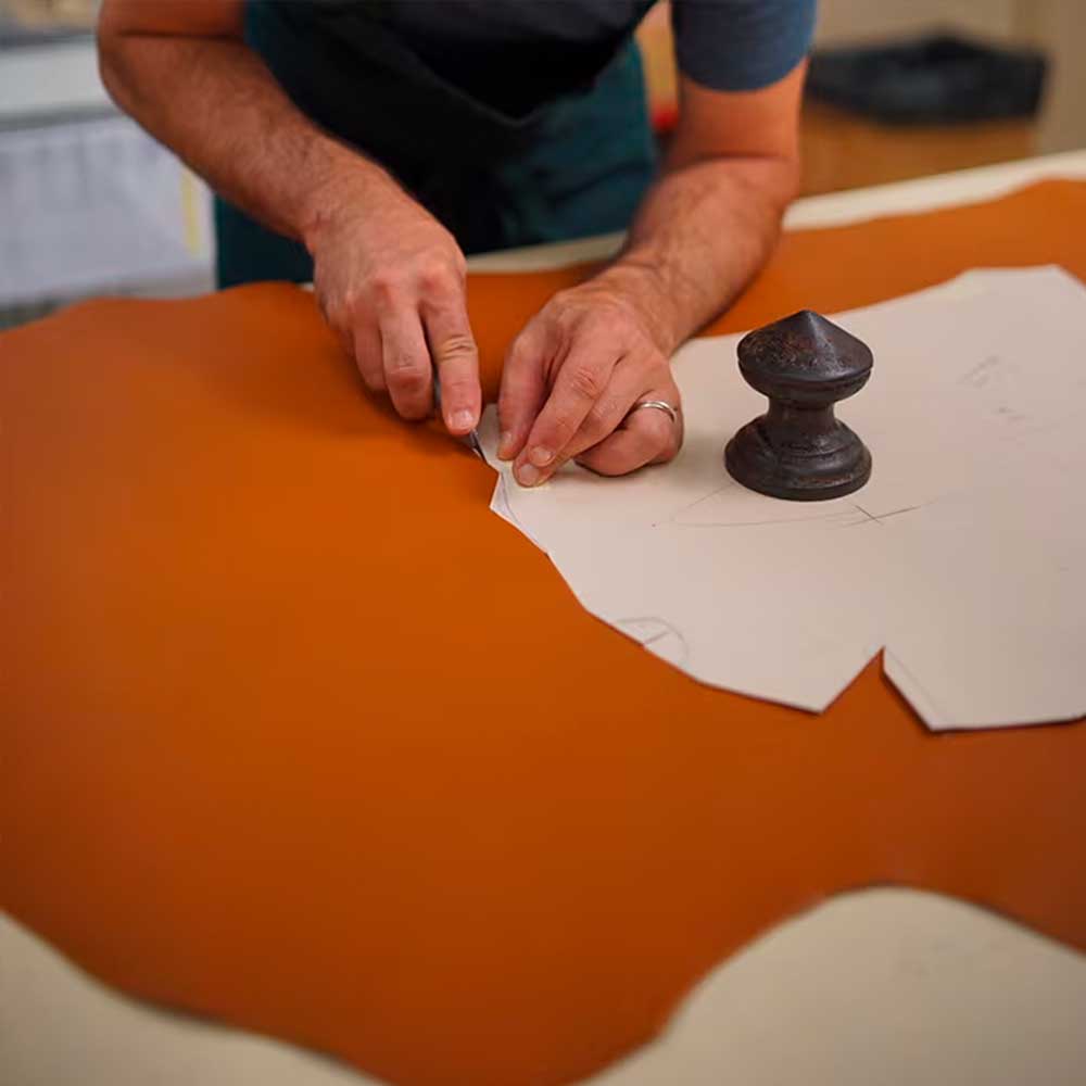 Where a subtle mix of aromas float in the air. A scent of leather, wood and oiled up tools, sharpened over time fill the atmosphere. A light tune of folding and riveting fills the room, but also the sound of hands assembling our pieces, both of these heard softly by our visitors ears.