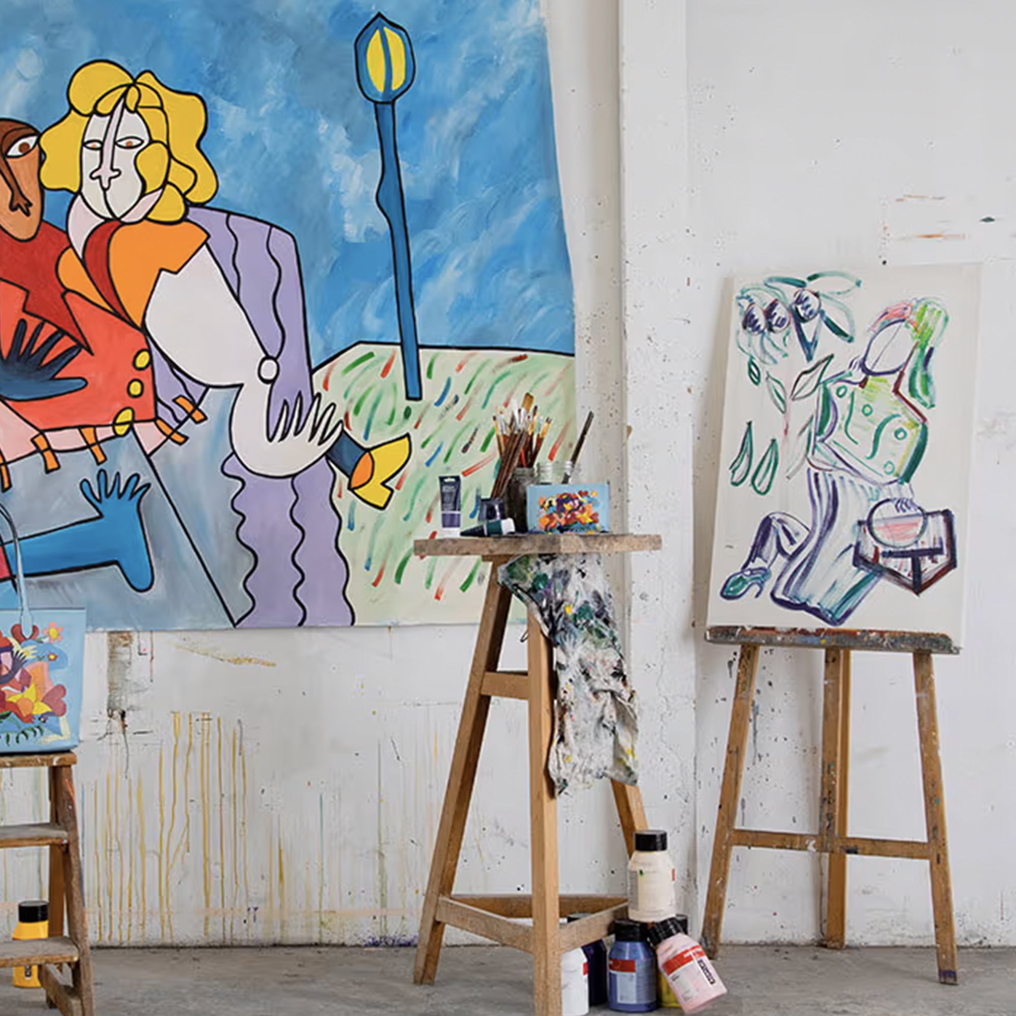 I think its authenticity lies in a play of contrasting colors, with black lines that surround what I shape. I also have a certain freedom in the way I form my characters, my objects, my shapes, my perspectives. I think this is what defines my uniqueness. Otherwise, I always work with acrylic paint and sometimes with oil paint.