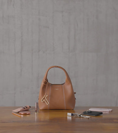 This small, soft handbag, made of grained leather and with uncut lines, features the House's signature silver T charms. It can be carried by hand, on the shoulder or crossed over with its removable shoulder strap.