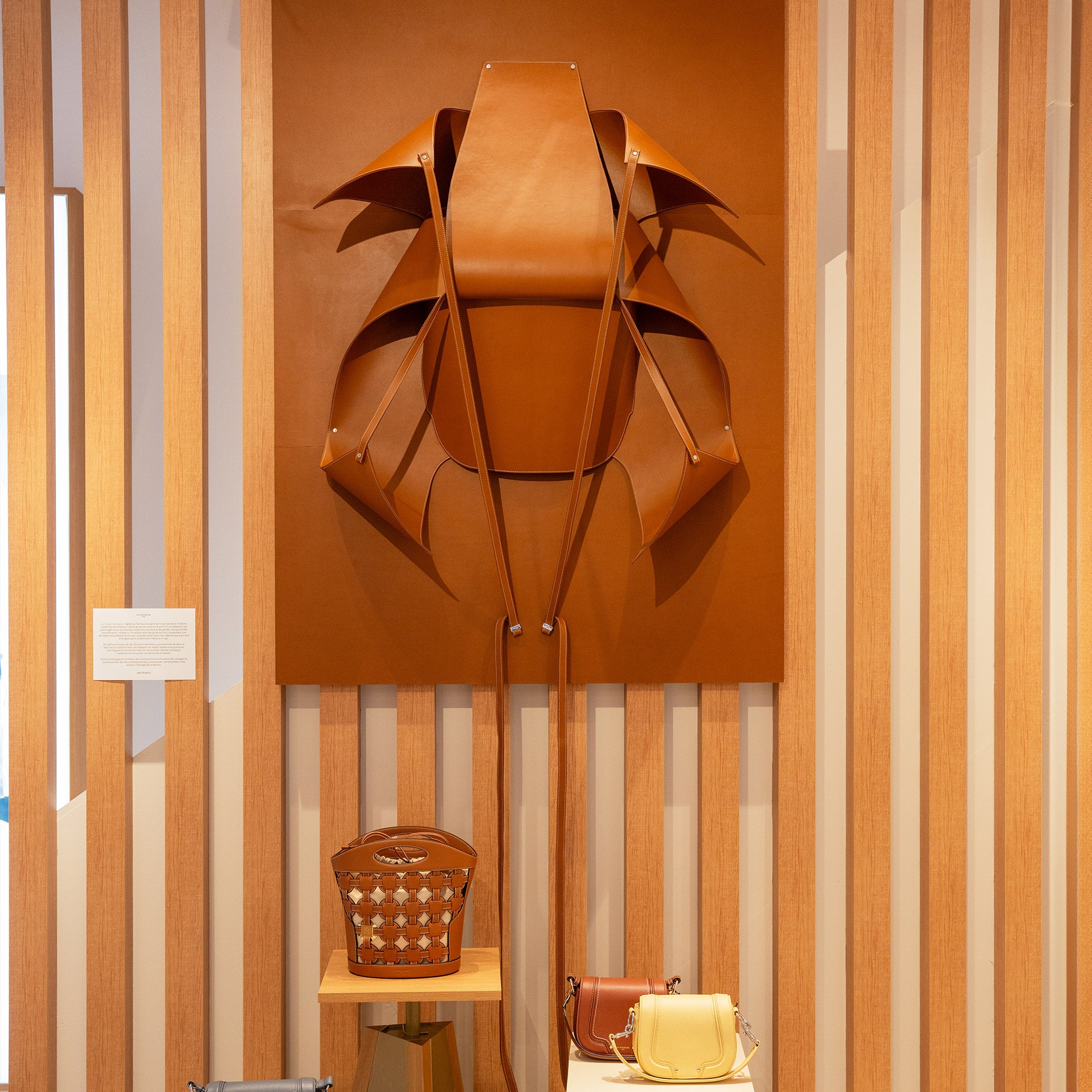 Para la inauguración, hemos vuelto a colaborar con el dúo de diseñadores dach&zephir. Ellos han creado una obra titulada Les Vestiges Recomposés, realizada a partir de una selección de patrones provenientes de diferentes colecciones de bolsos y pequeña marroquinería.