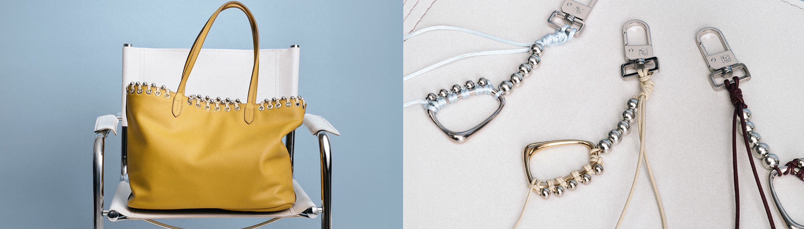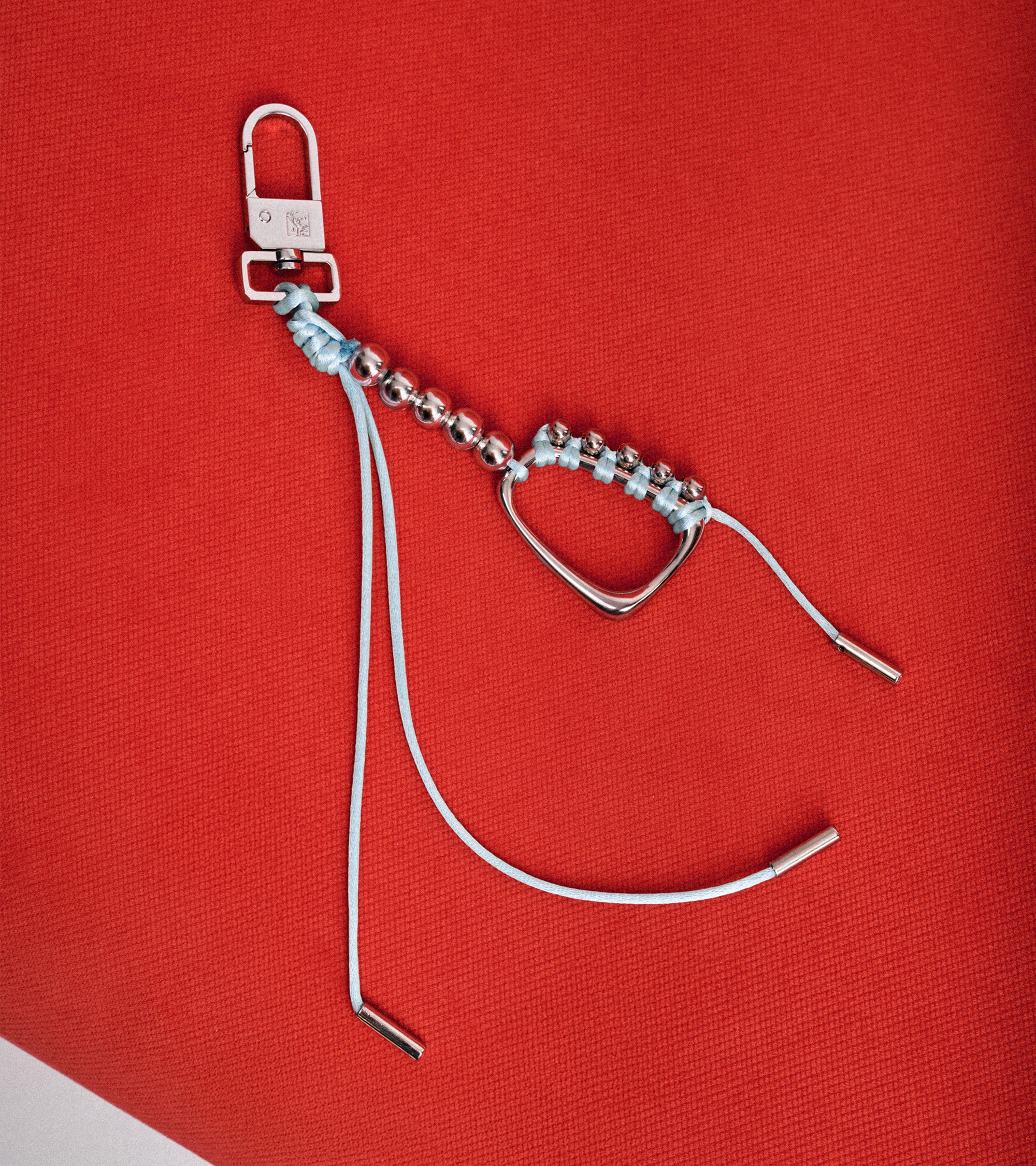 También creamos adornos para bolsos a partir de mosquetones de los stocks de la Maison, que volvimos a trenzar de forma diferente. Estos charms son objetos híbridos, que adornan un bolso, pero que también se pueden colgar en unos vaqueros, en un tote bag o en un llavero.