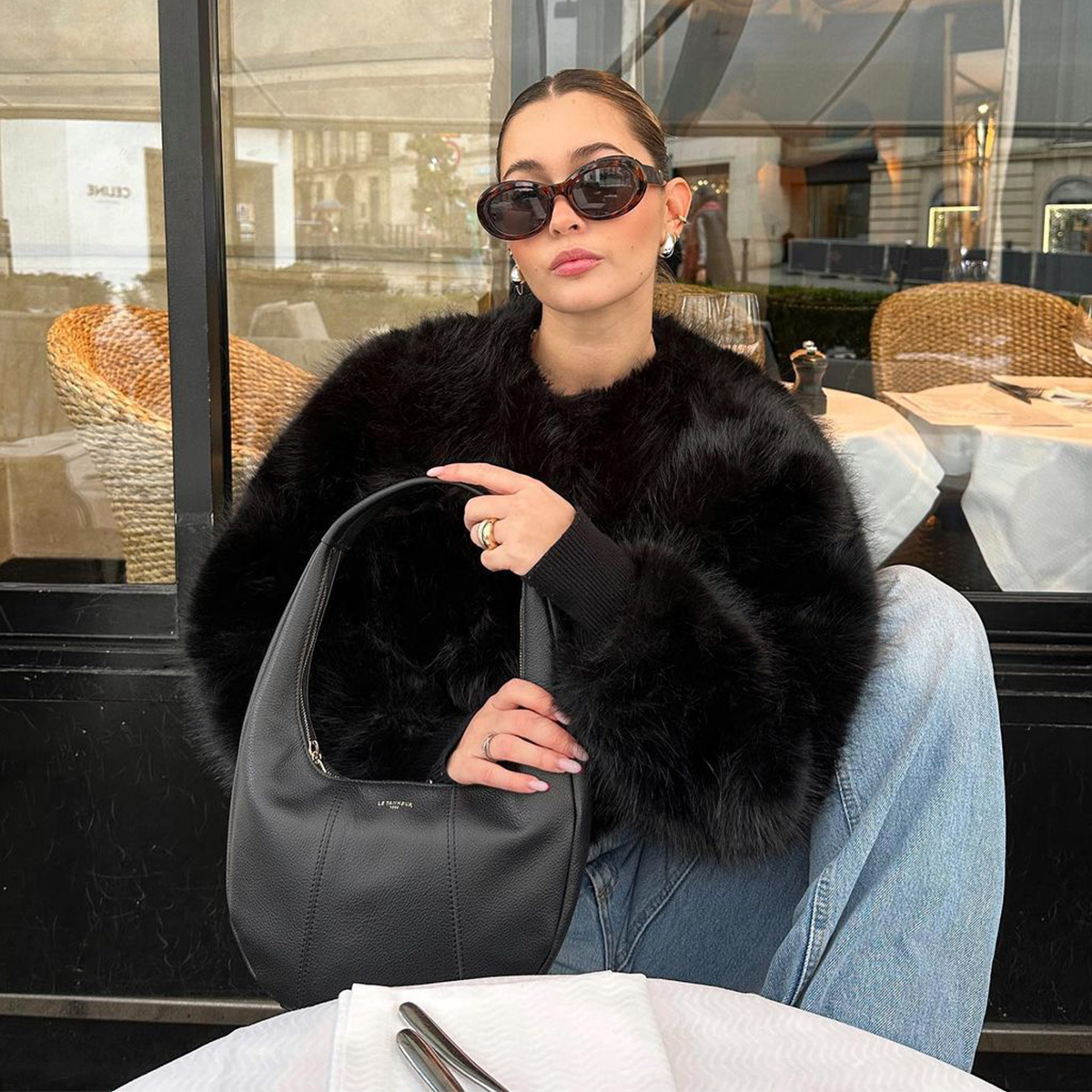 Bolso hobo de tamaño medio con cremallera y flecos de firma. Marca Le Tanneur y elementos metálicos con acabado dorado claro. De mano o al hombro.